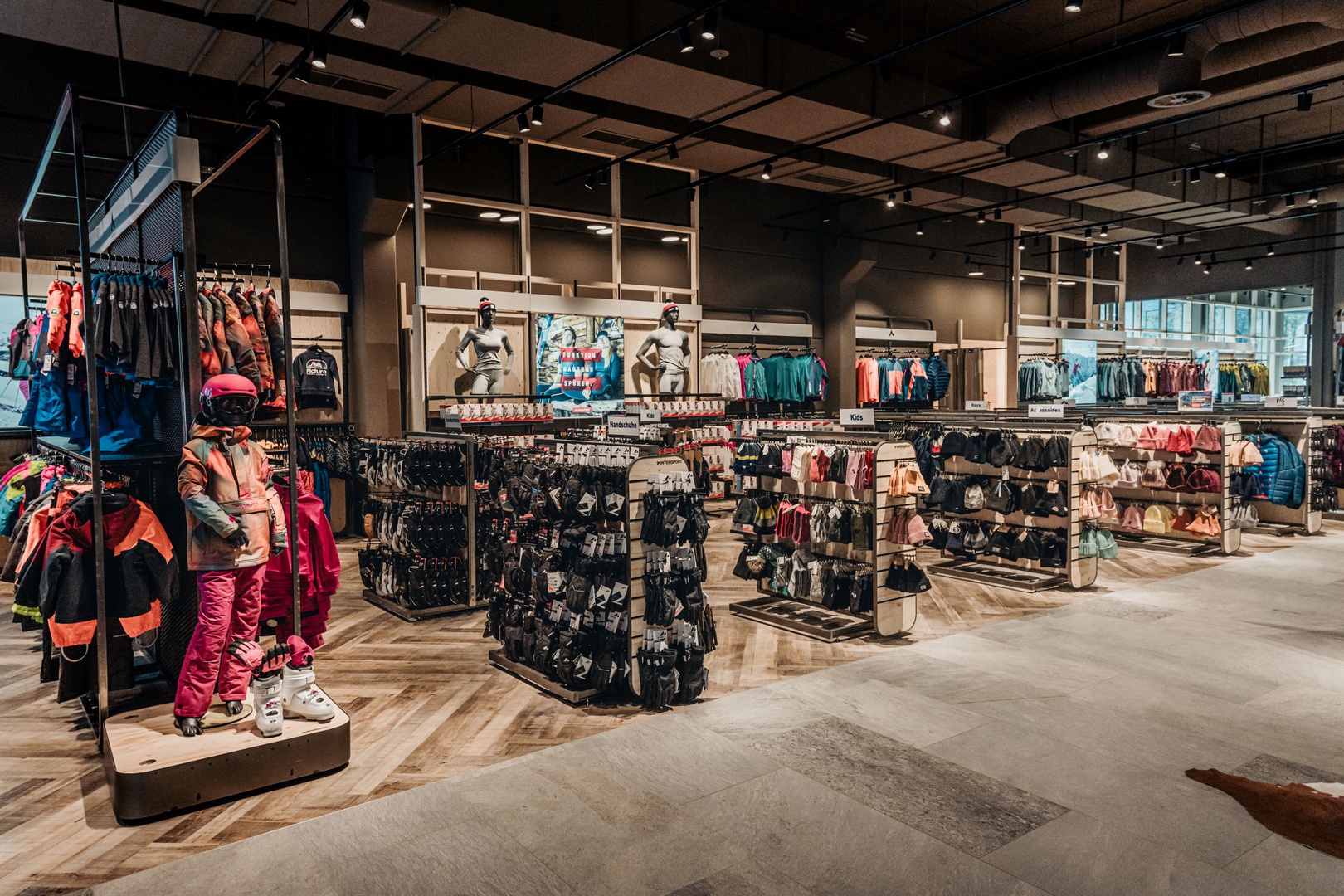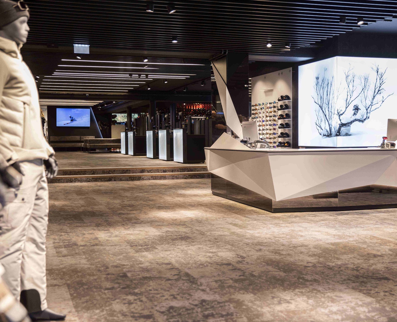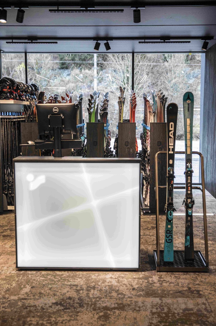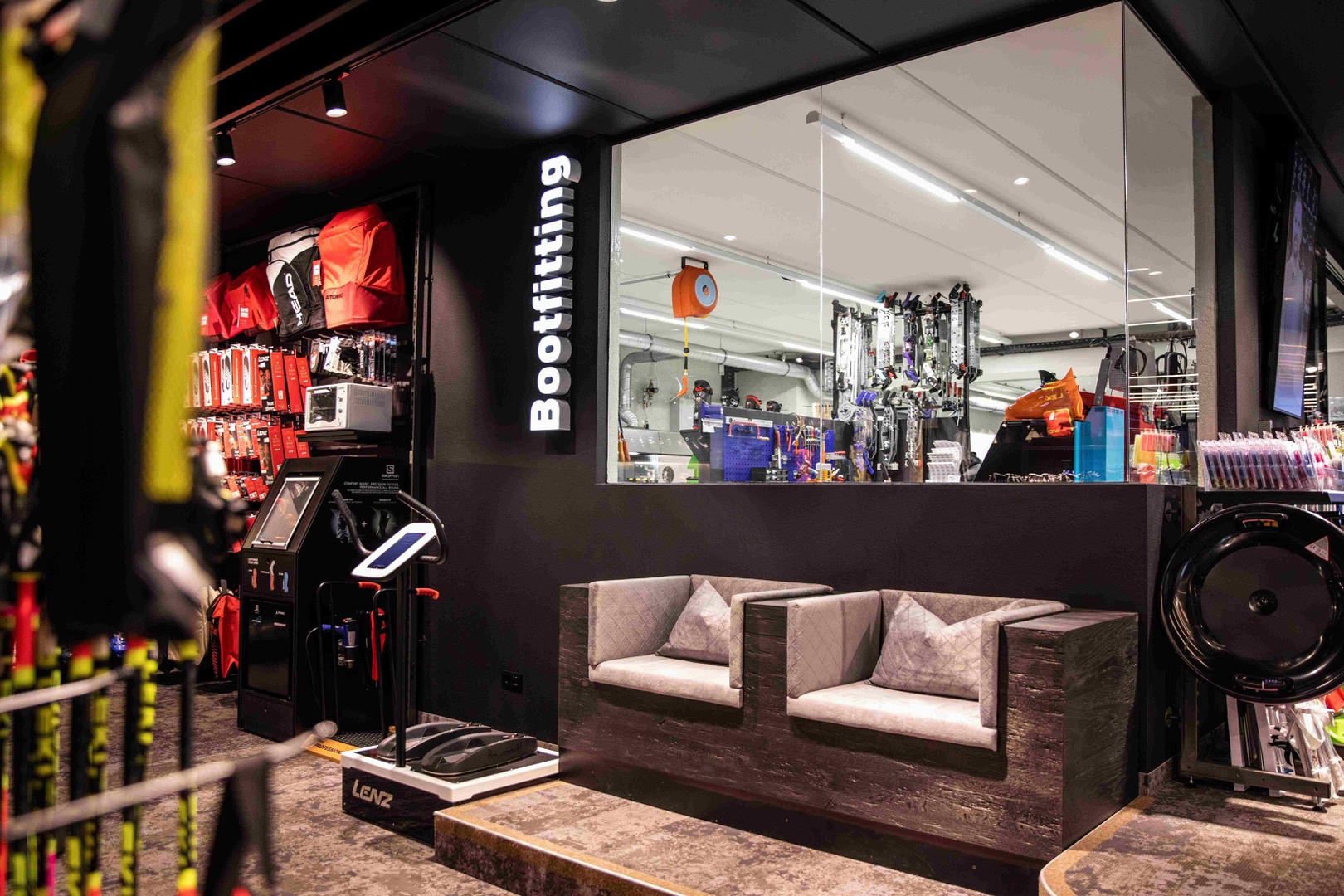 Viele Erlebnisse wurden eingearbeitet: vom SKISIMULATOR, dem BAUMHAUS für die Kids zum supercoolen RUNNING LAB sowie der Service BAR bis hin zu offenen Werkstattbereichen.