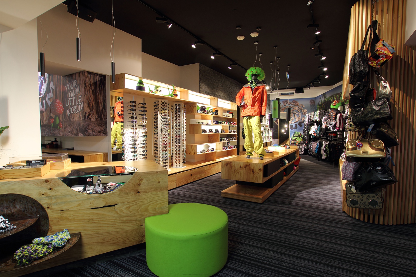 Das Moreboards in Sölden wurde ganz der MARKE entsprechend neu durchgedacht und mit „M O R E  BOARDS“ bespielt sind diese nicht nur dekorativer Natur sondern bilden verschiedene Möbel und raumbildende Strukturen. Weiters wurde mit einen Dekokonzept, das zum Moreboards Sideslogan „be nonconform“ spielt, verschiedene Themenbereiche gebildet. Dekohighlights wie eine Mischmaschine im Herrenbereich oder ein fußloser Flügel als Damenbereich-Highlight bilden einen Erlebnisraum für die Zielgruppe und stehen für einen unvergesslichen Einkauf.