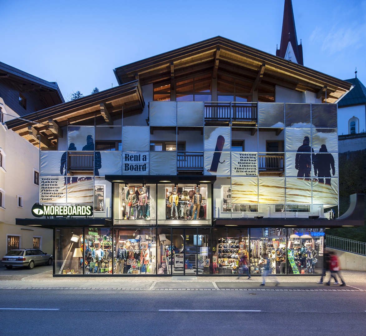 Das Moreboards in Sölden wurde ganz der MARKE entsprechend neu durchgedacht und mit „M O R E BOARDS“ bespielt sind diese nicht nur dekorativer Natur sondern bilden verschiedene Möbel und raumbildende Strukturen. Weiters wurde mit einen Dekokonzept, das zum Moreboards Sideslogan „be nonconform“ spielt, verschiedene Themenbereiche gebildet. Dekohighlights wie eine Mischmaschine im Herrenbereich oder ein fußloser Flügel als Damenbereich-Highlight bilden einen Erlebnisraum für die Zielgruppe und stehen für einen unvergesslichen Einkauf.