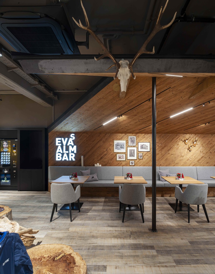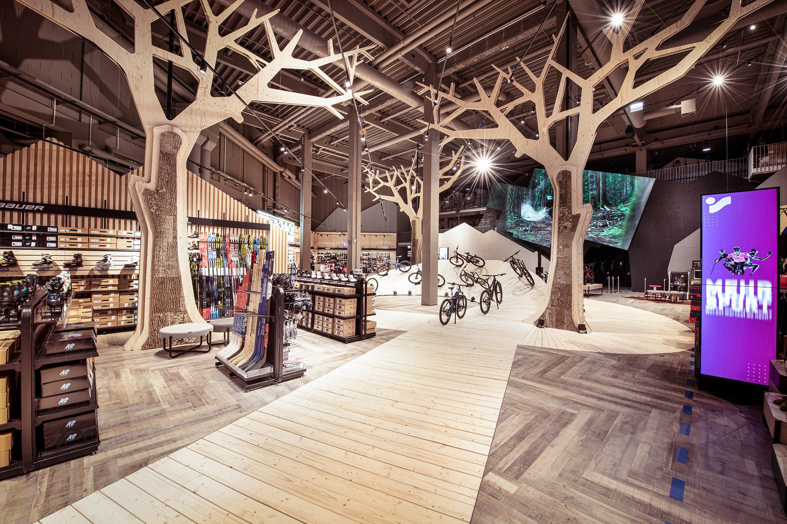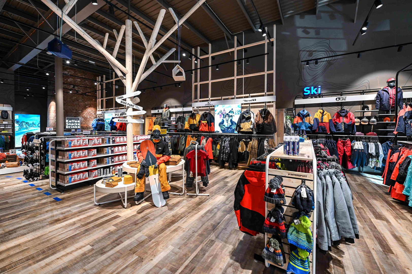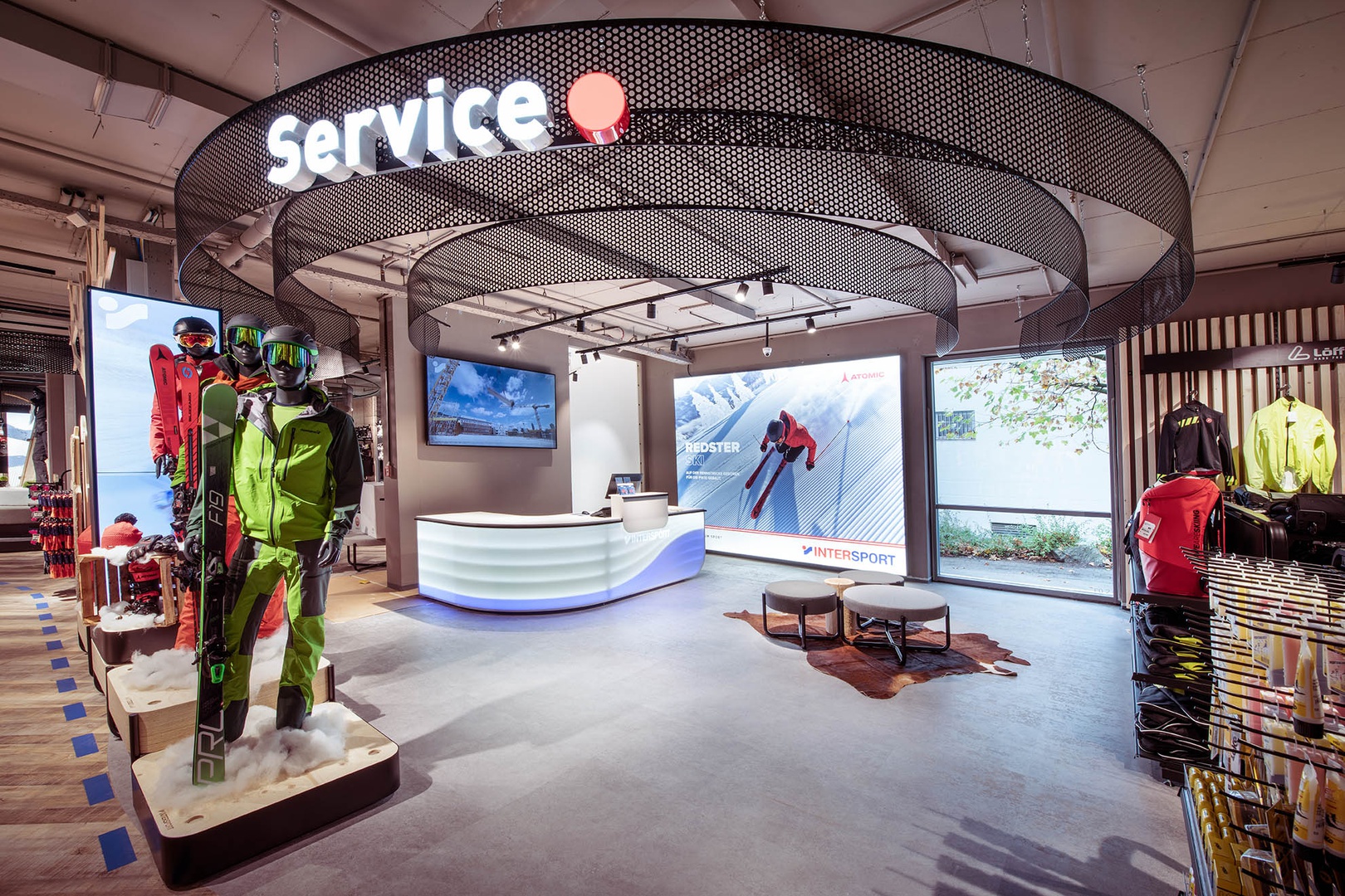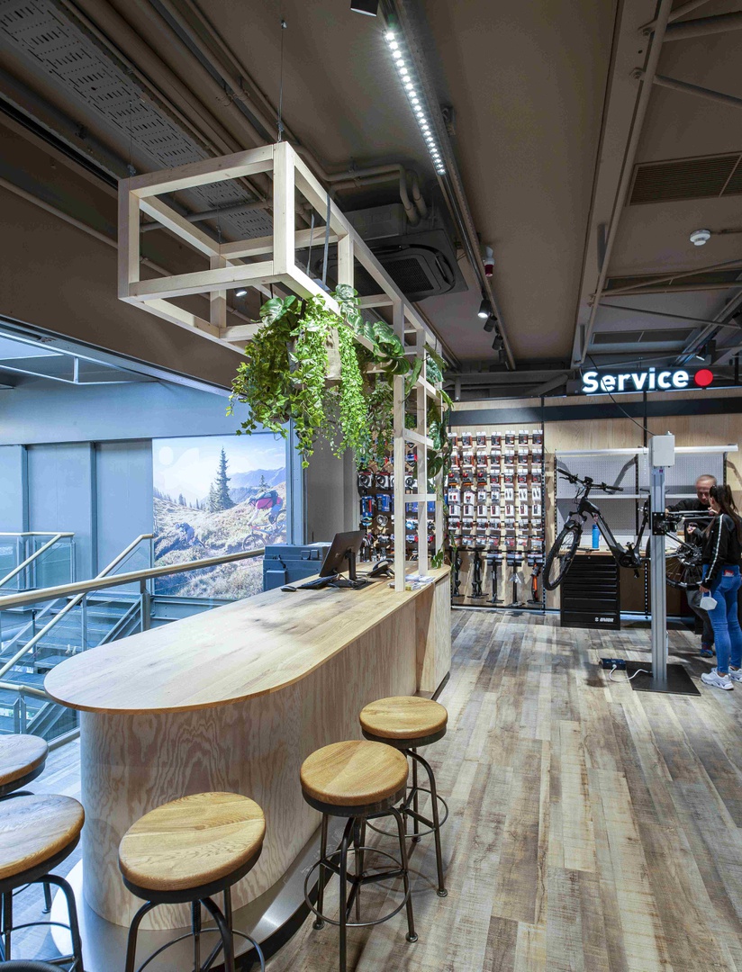 Viele Erlebnisse wurden eingearbeitet: vom SKISIMULATOR, dem BAUMHAUS für die Kids zum supercoolen RUNNING LAB sowie der Service BAR bis hin zu offenen Werkstattbereichen.
