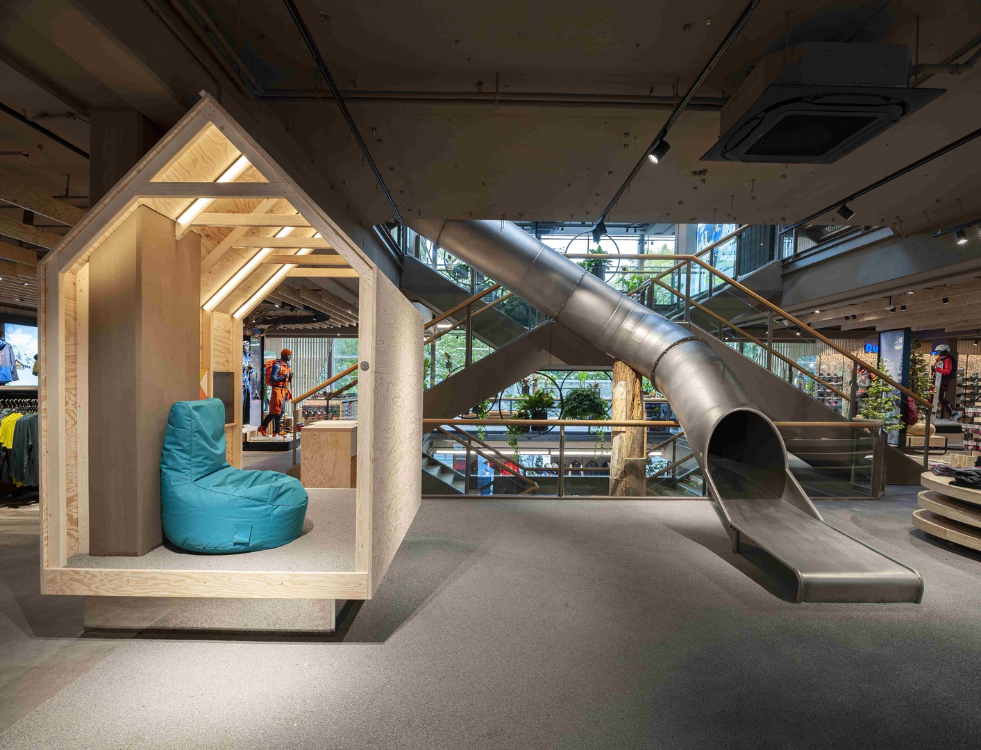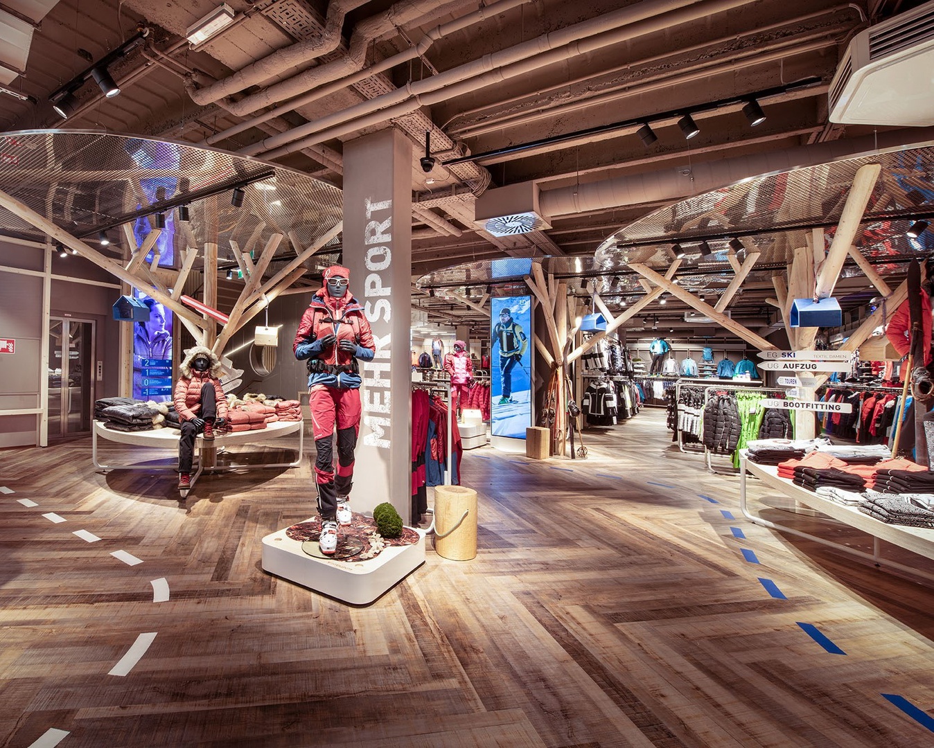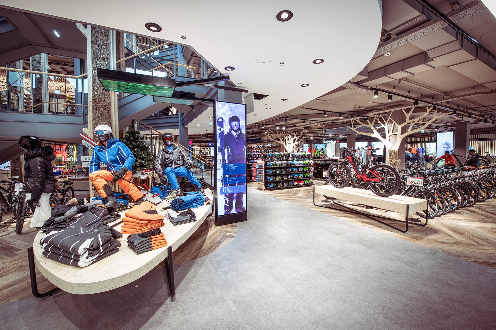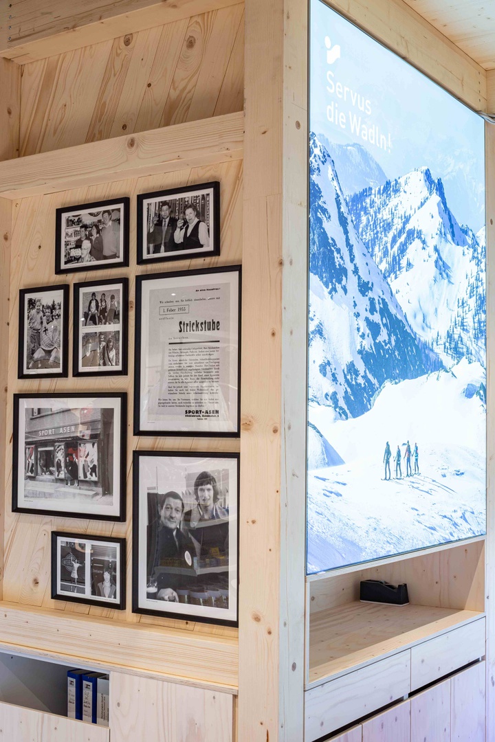 Viele Erlebnisse wurden eingearbeitet: vom SKISIMULATOR, dem BAUMHAUS für die Kids zum supercoolen RUNNING LAB sowie der Service BAR bis hin zu offenen Werkstattbereichen.