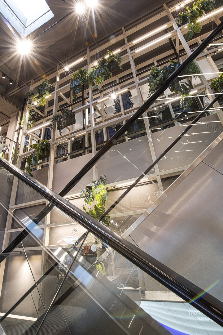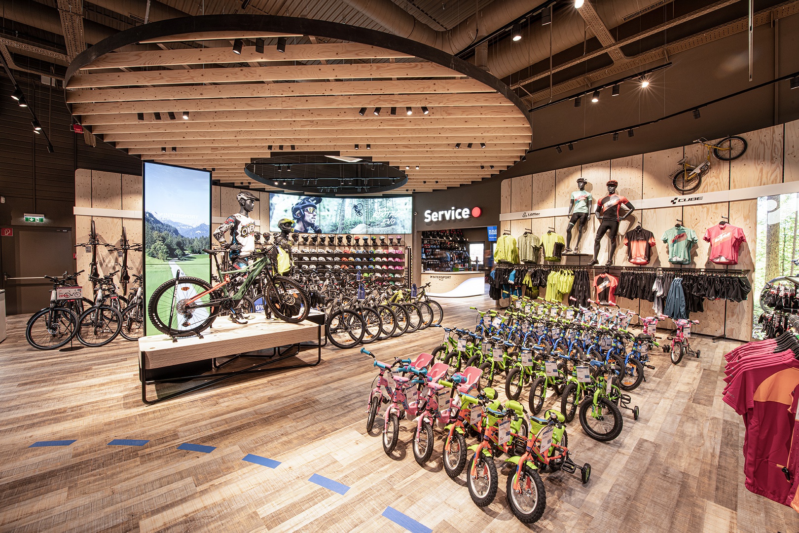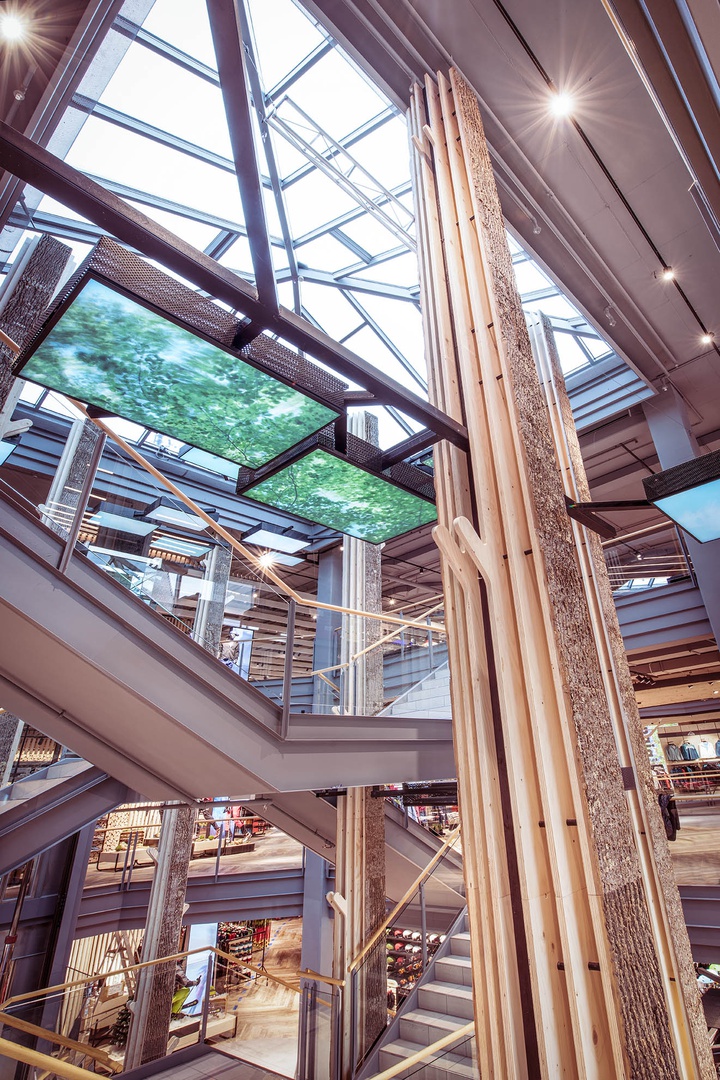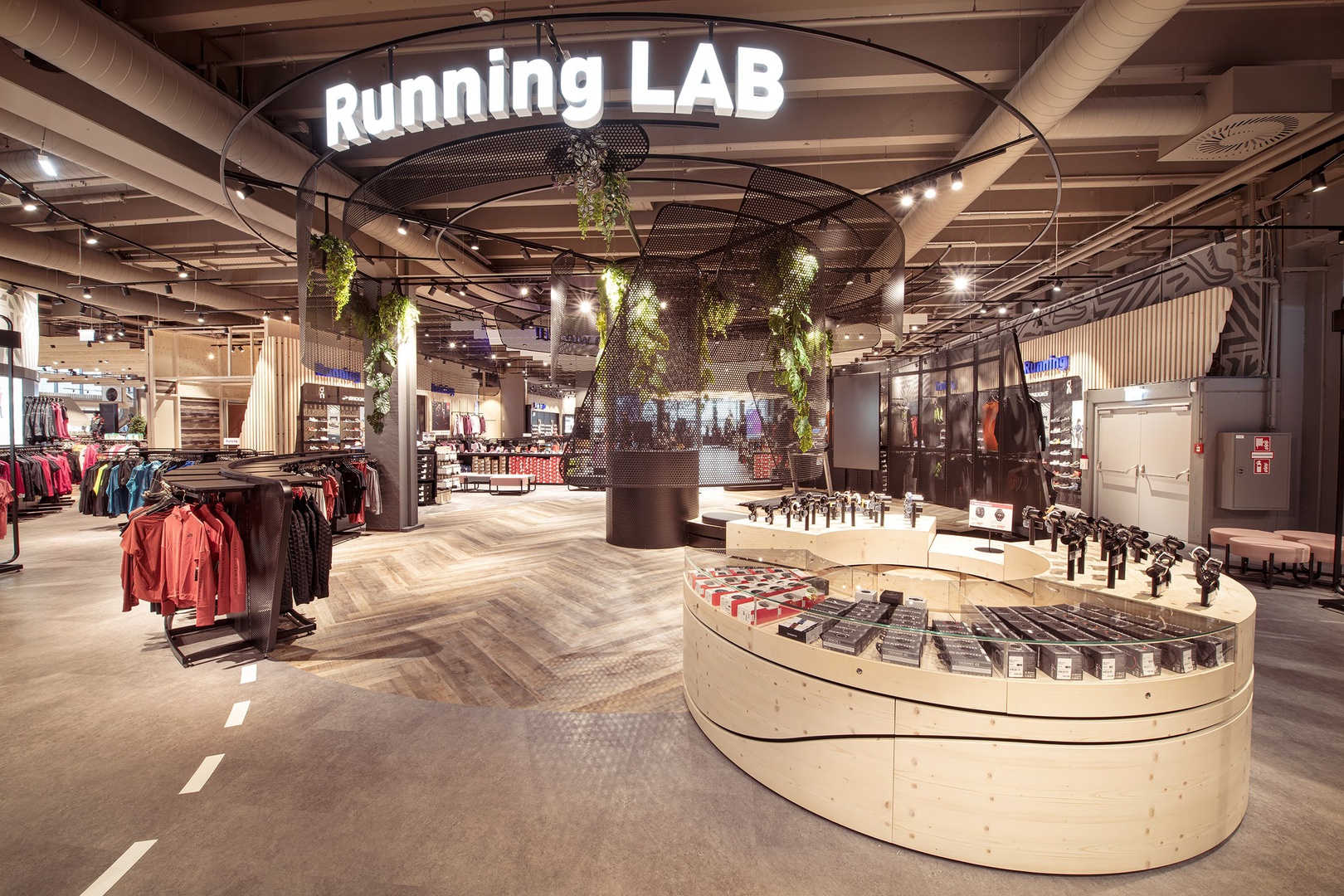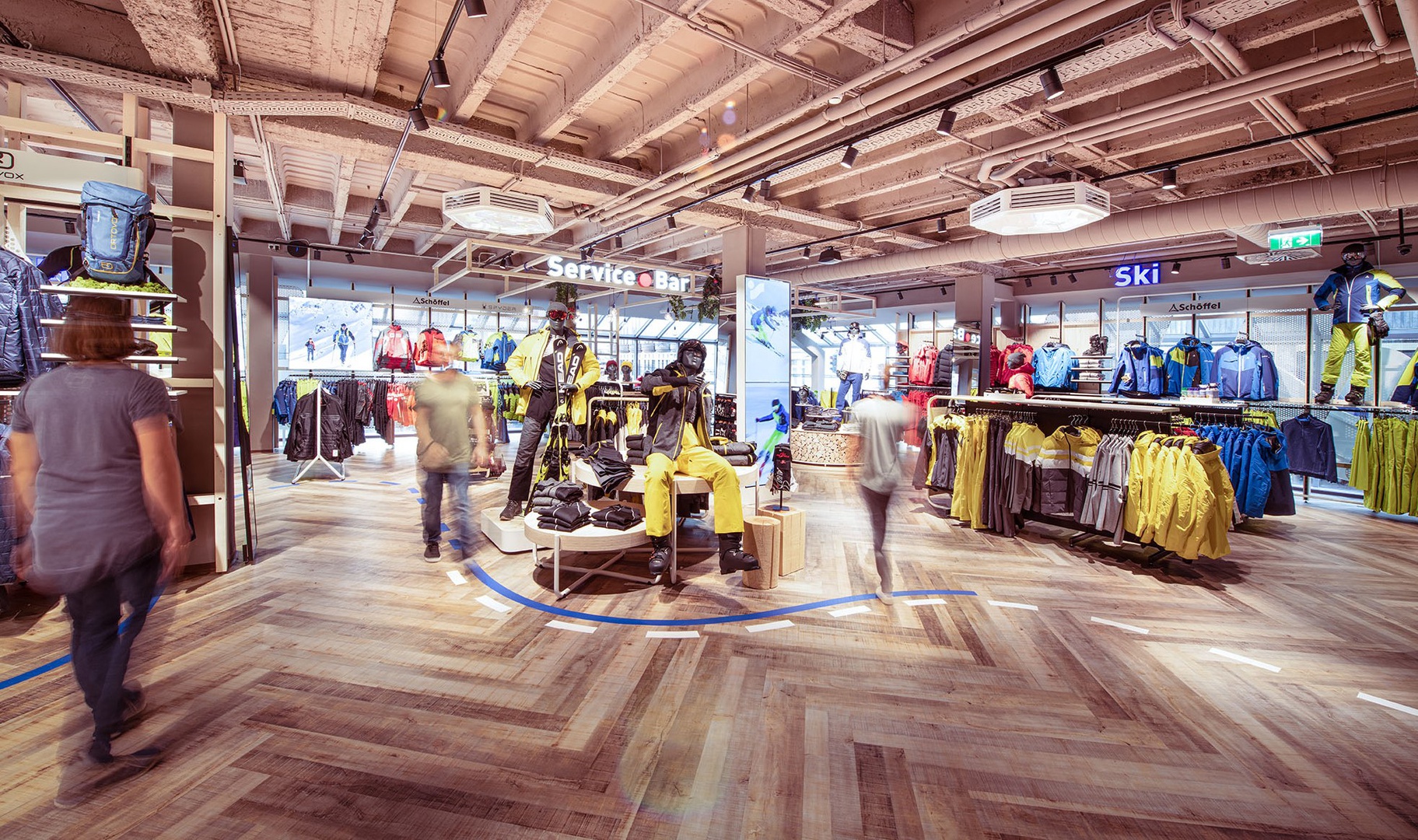 Viele Erlebnisse wurden eingearbeitet: vom SKISIMULATOR, dem BAUMHAUS für die Kids zum supercoolen RUNNING LAB sowie der Service BAR bis hin zu offenen Werkstattbereichen.