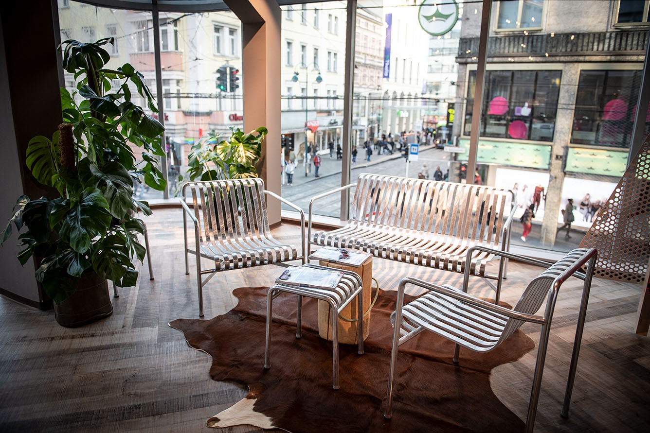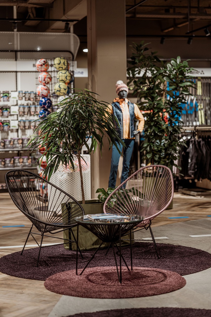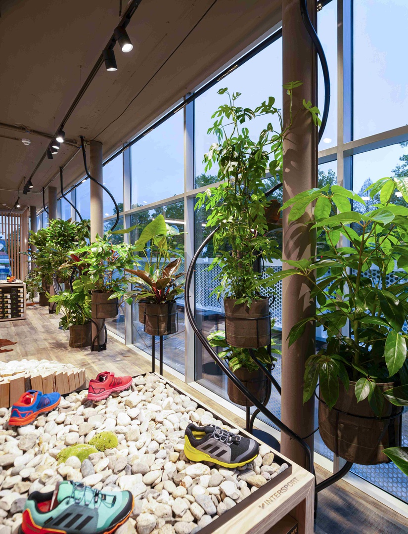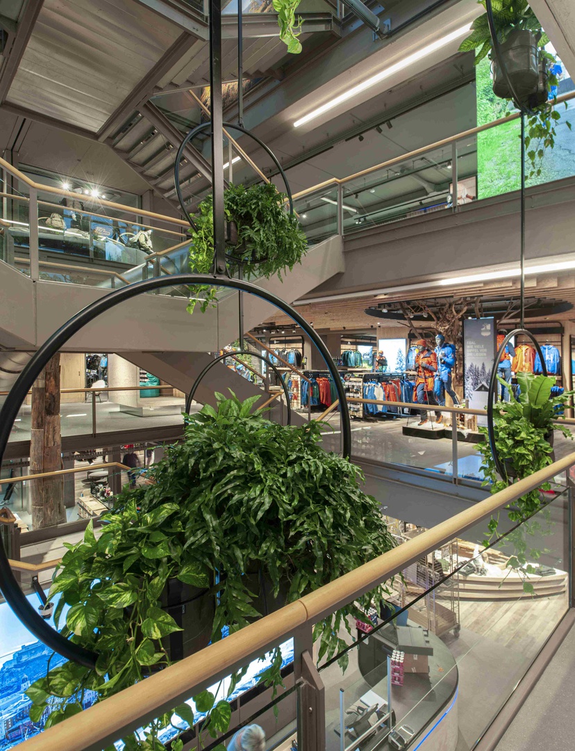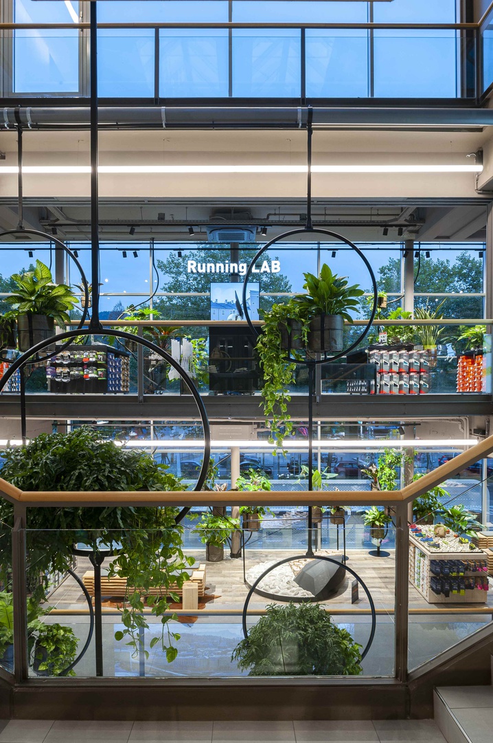 Mit reduziertem und minimalistischem Materialeinsatz wurde das Thema Sport in den Fokus gestellt und jedem Erlebnisbereich auf die Seele geschneidert. Eine Begrünung im Eingangsbereich, die sich über alle vier Geschoße zieht, eine Schneiderei, um deine Lieblingsteile zu ändern und im Sinne der Nachhaltigkeit zu reparieren, sowie ein Boulderblock, eine Kältekammer und ein Running Lab sind nur ein paar der vielen Highlights, um den Kunden im Flagshipstore zu begeistern und ihn in verschiedene Erlebnisse eintauchen zu lassen. Die lokale Künstlerin Hannah Philomena Scheiber konnten wir gewinnen, in jedem Geschoß Grafiken an die Wände zu bringen: von Zaha Hadids Hungerburgbahn zur Sprungschanze bis zum Landhausplatz samt Okay und der Aussichtsplattform am Stubaier Gletscher. Das alles mit SICHT auf die Nordkette in Innsbruck von den chilligen Loungebereichen aus.