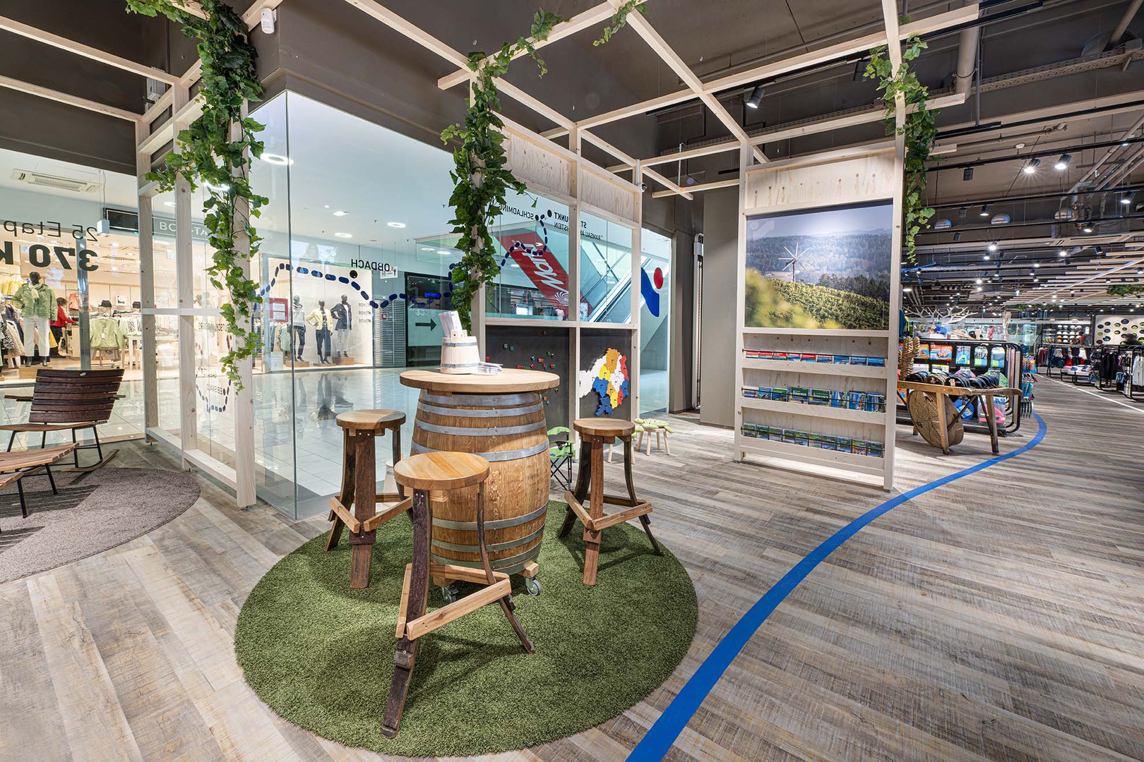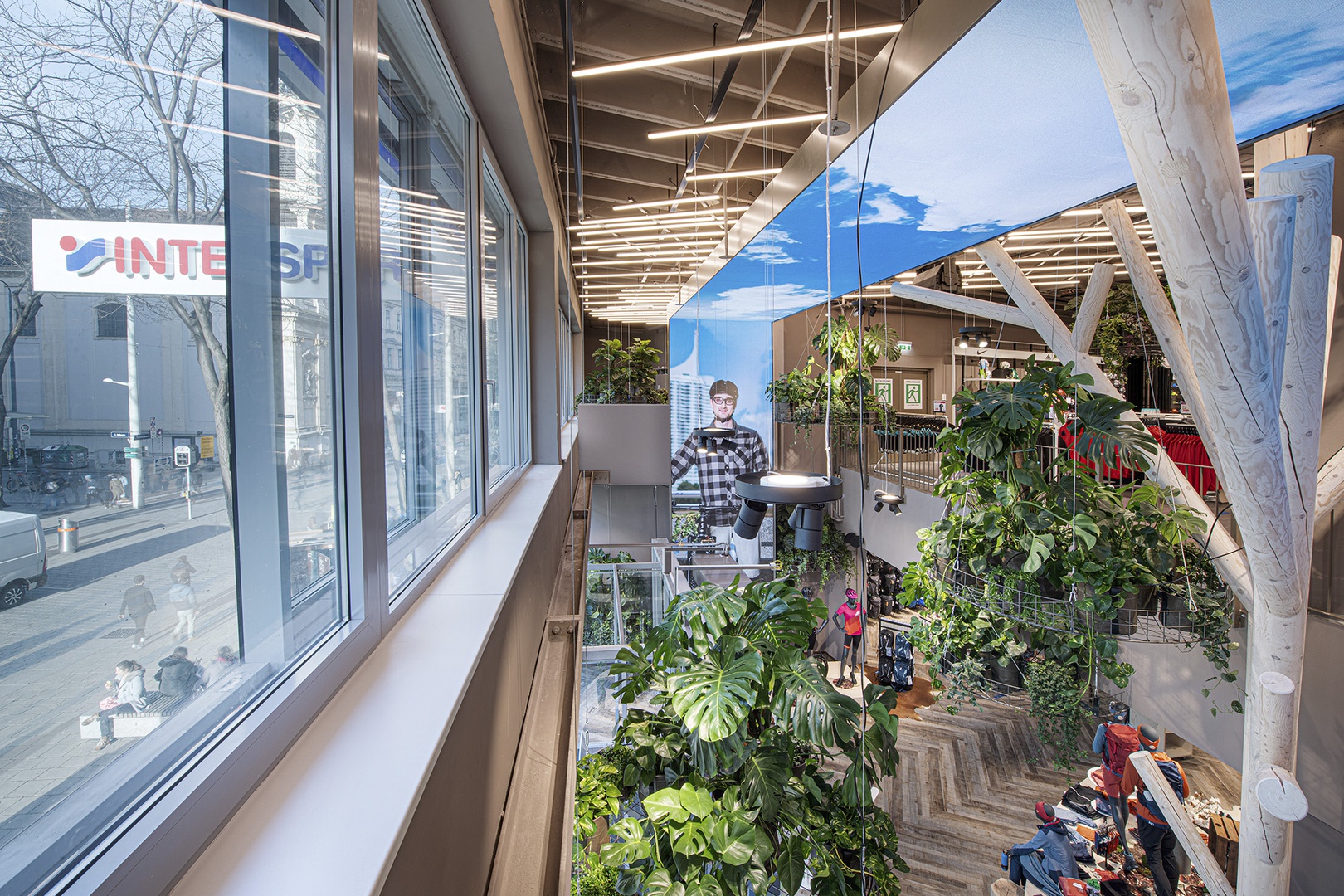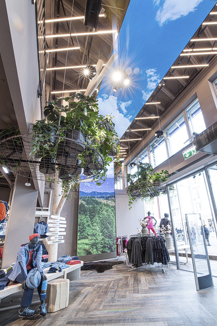 Mit besonderem Augenmerk auf den Außenauftritt und die Darstellung zur Einkaufsstraße hin, wurde eine Leuchtdecke mit einem Bildschirmframe kombiniert, welcher mit begrünten Inseln und Bäumen untermalt wurde. GRÜN als die Metapher für den Spezialisten im Bereich OUTDOOR, BIKE und SKI und auch als riesiges Zukunftsthema in den Innenstädten.